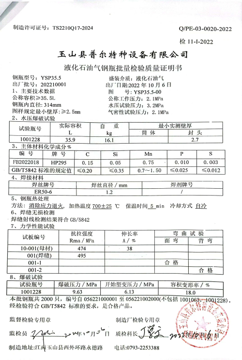 玉山县普尔特种设备有限公司位于江西省玉山县高新技术产业园区,公司占地面积31400平方米,建筑面积13200平方米。目前已经购置80余台生产设备及检验、检测设备和成套计量器具,生产设备自动化程度高。目前配置封闭式自动液化石油气钢瓶生产线1条,为保障公司产品质量,为年产能力100万只创造了必备的条件。公司管理层对液化石油气钢瓶制造具有丰富的管理经验,现有员工50余人,各类专业技术人员10余名,拥有气保焊焊工及无损检测人员,有液化石油气钢瓶制造相配套的试验和检验设备,有完整的质量管理体系,完全能满足液化石油气钢瓶制造的需求,为用户生产优质、安全、使用性能可靠的液化石油气钢瓶。公司紧邻320国道、G60高速公路和高铁玉山南站,交通便利,区位优越。自公司成立起,就确立了“质量为上”是公司永恒的宗旨,将严格控制产品质量,产品至上,客户至上,服务至上,满意至上...